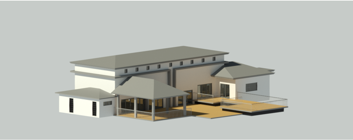 level. The large patio will host and outdoor kitchen attached to the main kitchen via folding glazed panels. The outdoor spaces focal point would be a sunken hot tub and adjoining swimming pool.